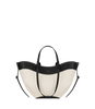 A sculptured compact tote bag featuring waves, folds, and curves. Its straps are hand-knotted and underline its signature shape. The canvas edition is a summer-inspired reinterpretation strengthened by a leather base.