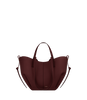 This sculptured compact tote bag featuring waves, folds, and curves can be used in two ways. Basket-style, with its sides open and straps on the outside, or As a flower-like closed bag, with its sides tucked in and its straps crossed on the inside.