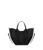 This sculptured compact tote bag featuring waves, folds, and curves can be used in two ways. Basket-style, with its sides open and straps on the outside, or As a flower-like closed bag, with its sides tucked in and its straps crossed on the inside.