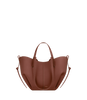 This sculptured compact tote bag featuring waves, folds, and curves can be used in two ways. Basket-style, with its sides open and straps on the outside, or As a flower-like closed bag, with its sides tucked in and its straps crossed on the inside.