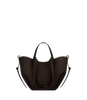 This sculptured compact tote bag featuring waves, folds, and curves can be used in two ways. Basket-style, with its sides open and straps on the outside, or As a flower-like closed bag, with its sides tucked in and its straps crossed on the inside.