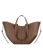 This sculptured tote bag featuring waves, folds, and curves can be used in two ways. Basket-style, with its sides open and straps on the outside, or As a flower-like closed bag, with its sides tucked in and its straps crossed on the inside.