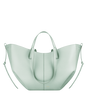 This sculptured tote bag featuring waves, folds, and curves can be used in two ways. Basket-style, with its sides open and straps on the outside, or As a flower-like closed bag, with its sides tucked in and its straps crossed on the inside.