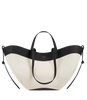 This sculptured tote bag featuring waves, folds, and curves can be used in two ways. Basket-style, with its sides open and straps on the outside, or As a flower-like closed bag, with its sides tucked in and its straps crossed on the inside.