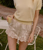 In buttery silk satin, the ‘30s-inspired Iona Short is an effortless pull-on style, featuring a high waist trimmed with elastic scallop detailing and intricate floral lace at the hems.