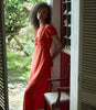 In sublime silk-satin, the ‘30s-inspired Léana Dress features intricate floral embroidery at the front bodice, short puffed sleeves edged in piping, a gathered bust, and plunging V-neckline with a keyhole tie detail. An empire waist with an invisible side-seam zipper offers a flattering silhouette, extending into an ankle-grazing bias-cut skirt.