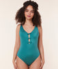 V-neck allover medium seat coverage and featuring adjustable straps. one-piece with bow detail